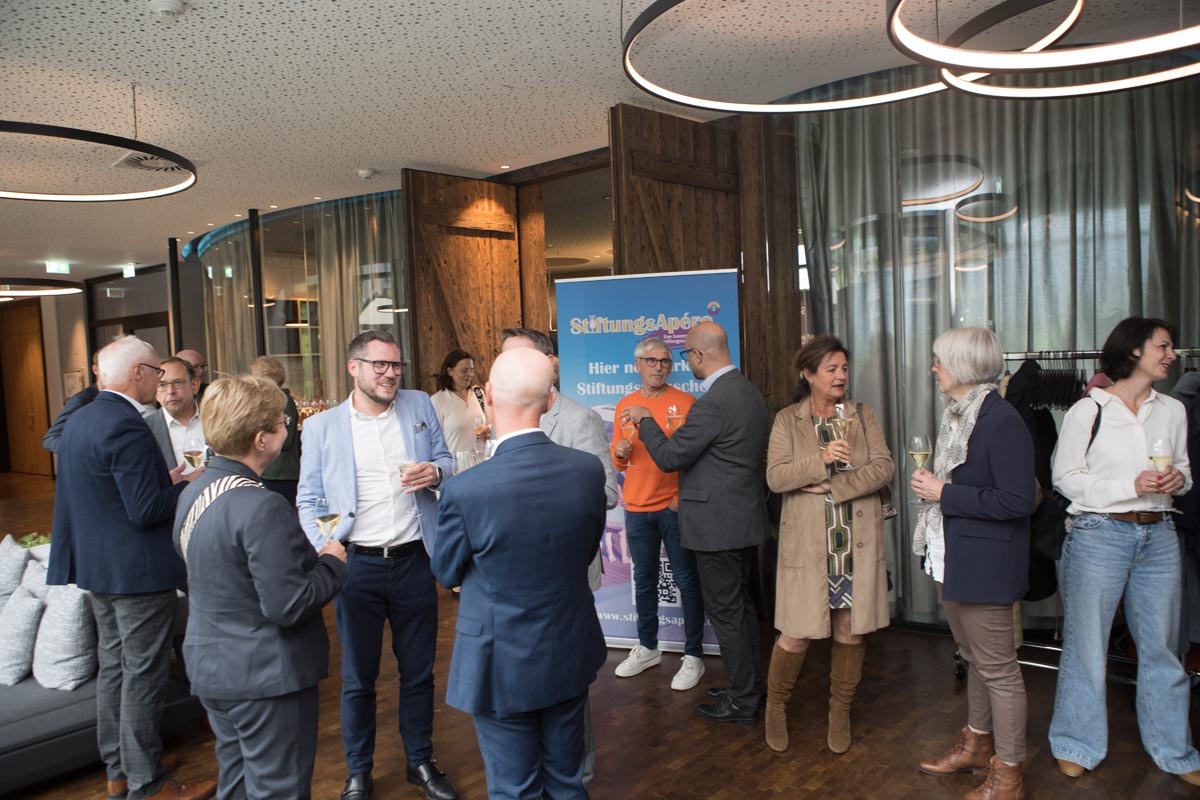 Highlights unseres Veranstaltungsraums waren einmal ein Austritt auf eine Wiese, die den Blick auf Teile des Schwarzwalds eröffnete, sowie ein schwere Holztür, 4 Meter hoch, die für ein besonderes Maß an Gemütlichkeit sorgte. Knapp 40 Gäste kamen schlussendlich zum StiftungsApéro in Freiburg.