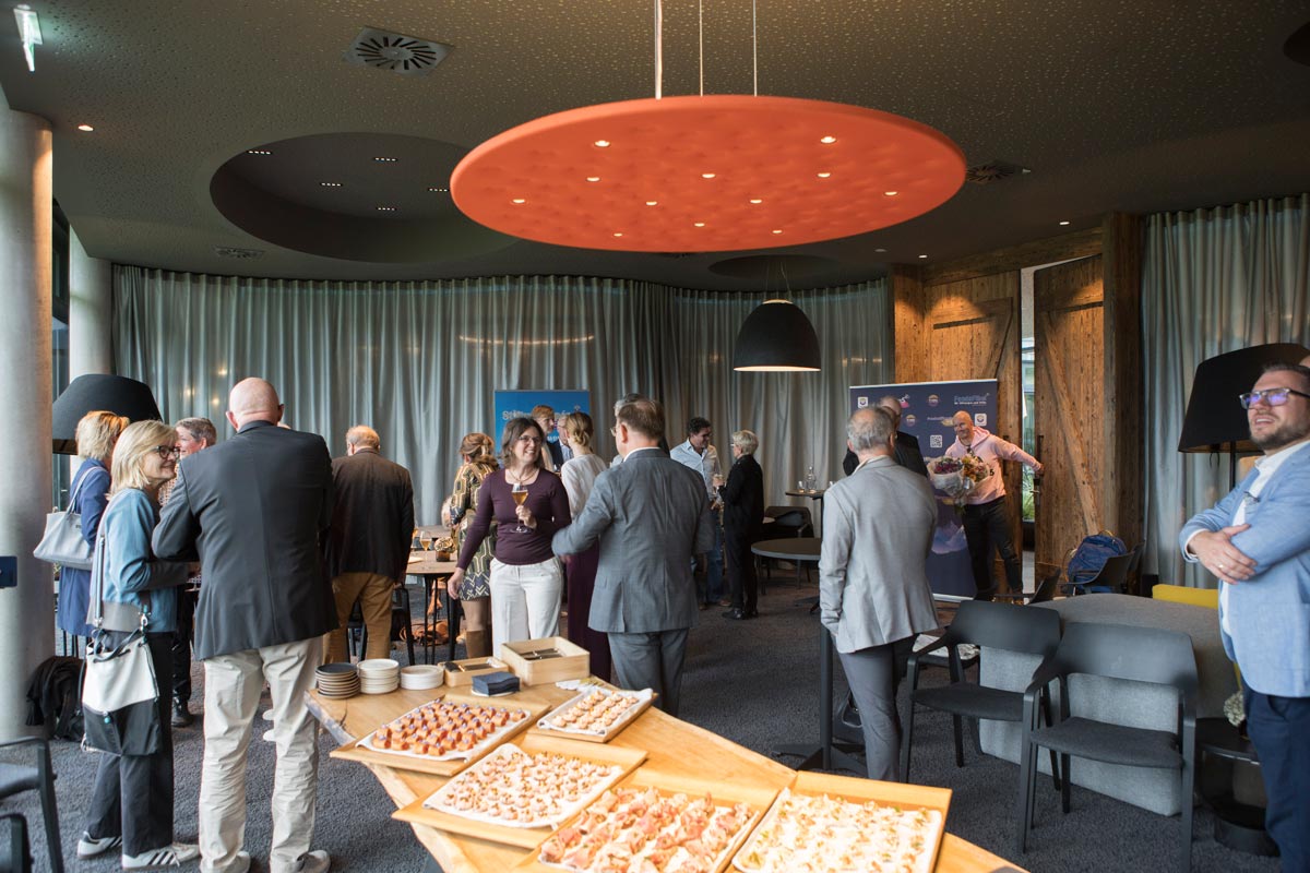 Im Hintergrund ist zu sehen, wie stiftungsmarktplatz.eu-Gründer die Tür zuzieht, mit zwei Blumensträußen in der Hand. Die Gäste brauchten sich gar nicht hinsetzen, denn seiner Bitte folgend intonierte das Auditorium zweimal Happy Birthday. Für die beiden Geburtstagskinder …